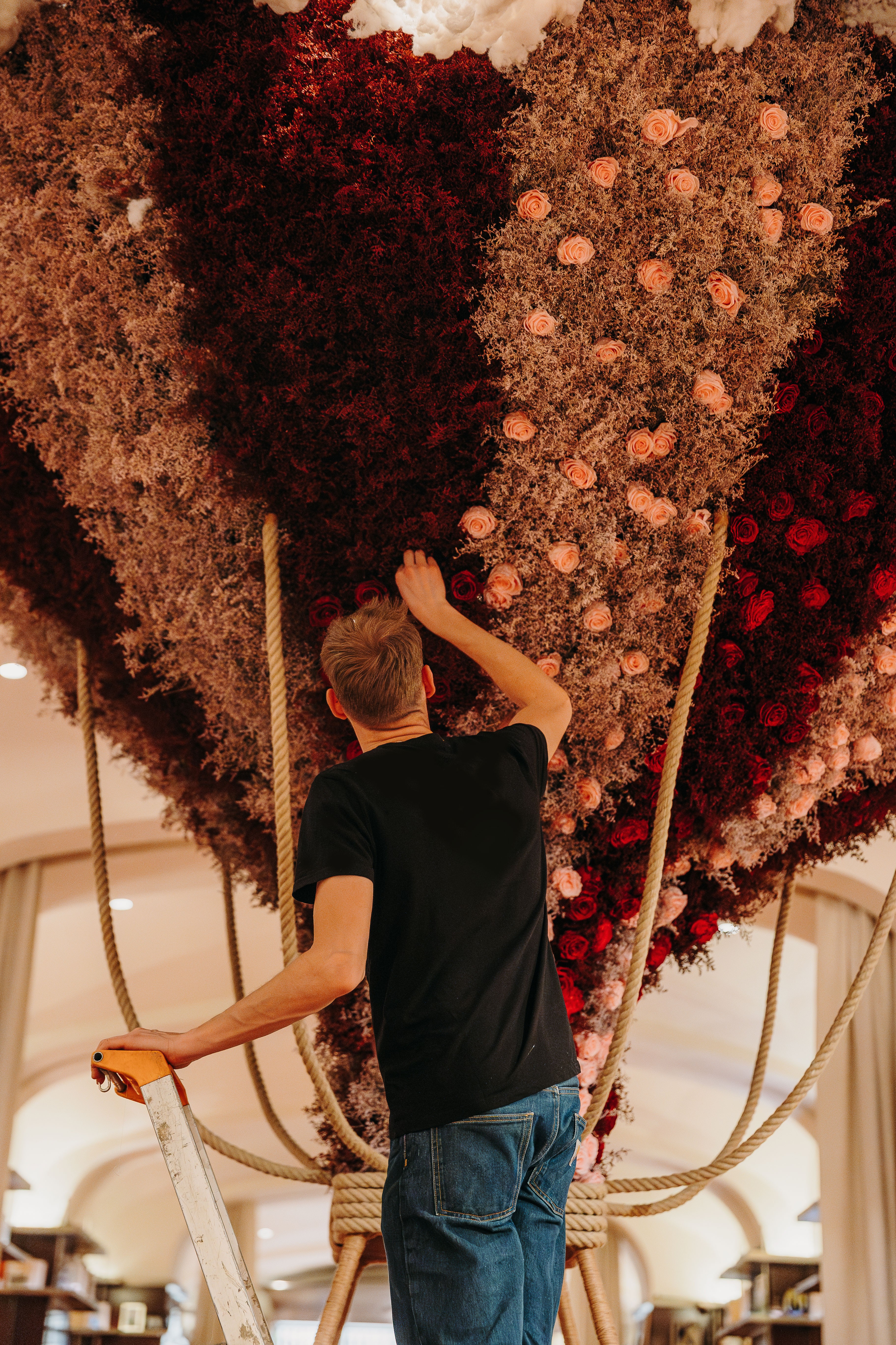 Pour la Saint-Valentin, le Royal Monceau accueille une installation signée Anthony Denis : une montgolfière recouverte de roses rouges et roses, posée avec élégance au centre du hall. Chaque pétale semble célébrer l’amour et la douceur de cette journée, créant un décor à la fois romantique et raffiné, où les visiteurs peuvent se laisser transporter par la poésie des fleurs.